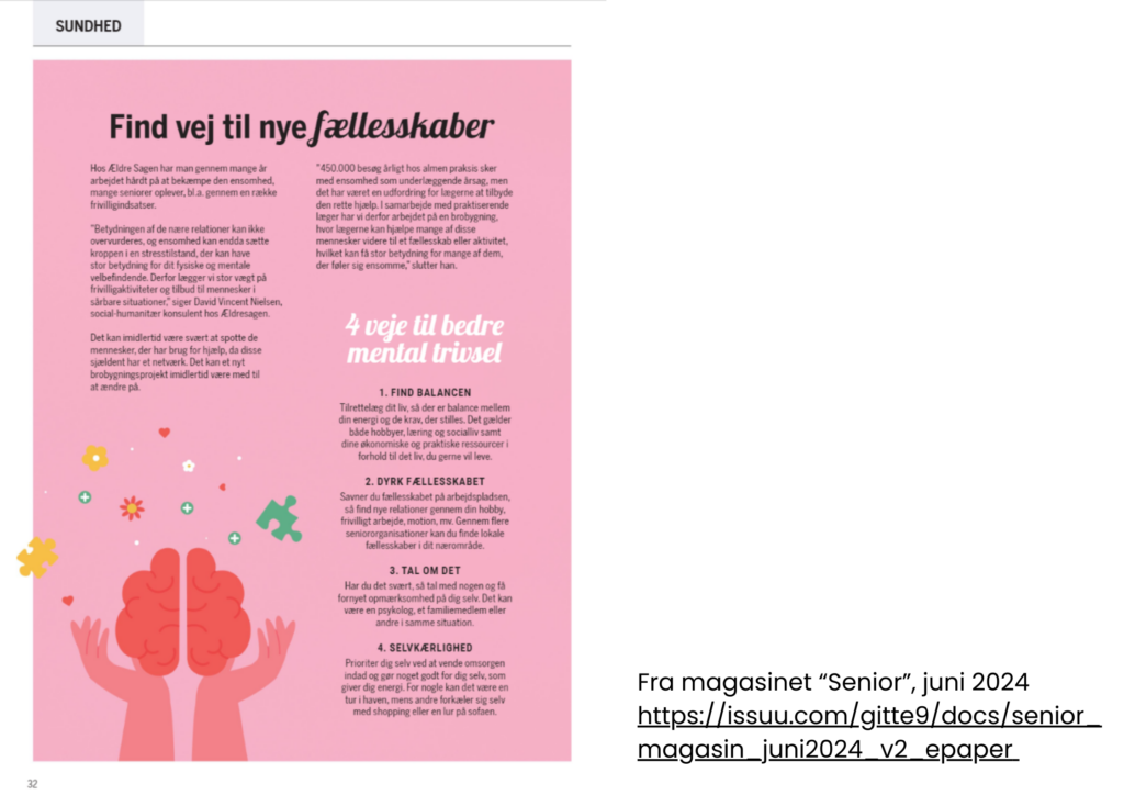 I juni udgaven fra 2024 kan du i magasinet “Senior” læse mig udtale mig om mental sundhed og hvordan vi passer på os selv i seniorlivet. Min pointe er egentlig simpel – vi bliver aldrig for gamle til at udvikle os eller lære noget. Det er ikke for sent.