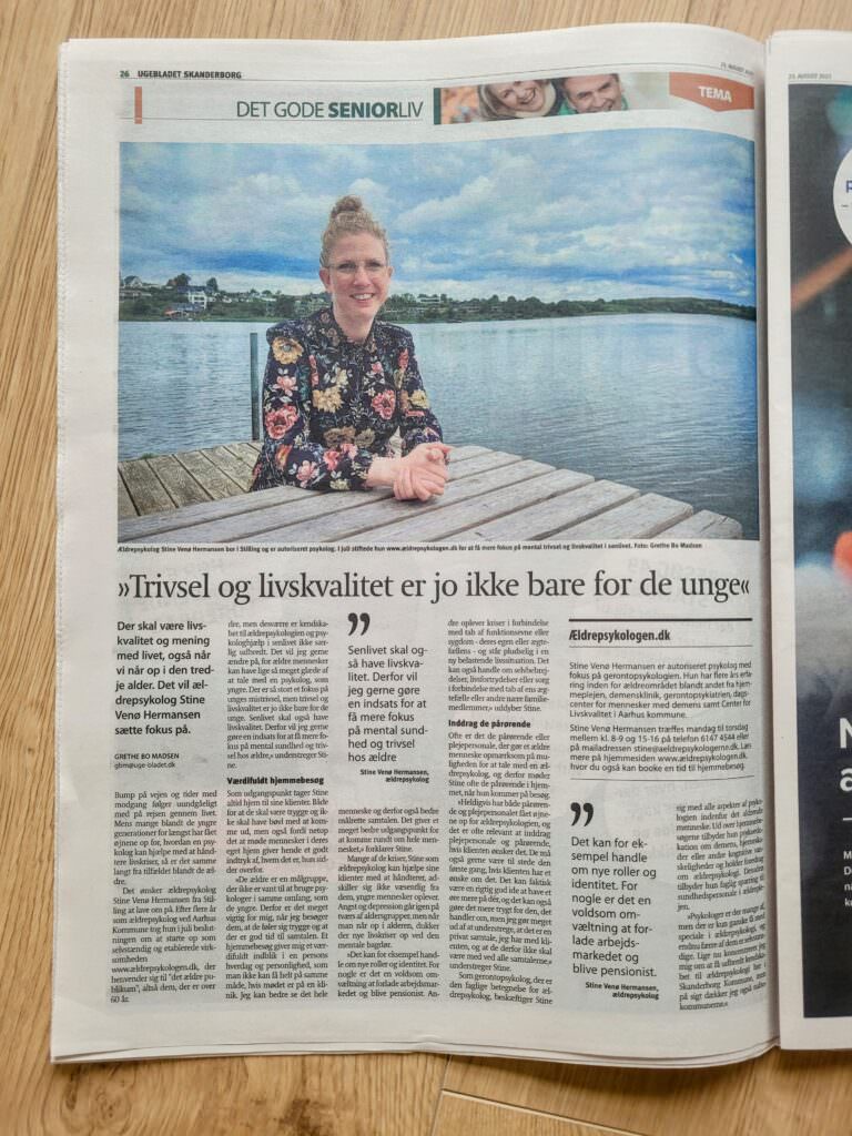 Jeg har talt med Uge-bladet Skanderborg omkring mit lille firma som selvstændig seniorpsykolog. Jeg fortalte om ældrepsykologiske udfordringer, og om hvordan psykologhjælp som hjemmebesøg nu er muligt for borgerne i Skanderborg og nabokommunerne. Som psykolog nær Skanderborg er det vigtigt for mig, at lokalområdet får sat ansigt på mig, og får indblik i det jeg tilbyder.